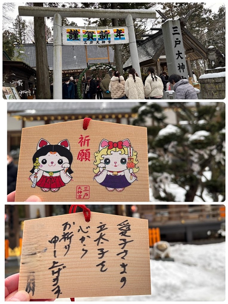年越しした岩手県の金田一温泉から二駅の三戸駅からタクシーで詣でました。天照大御神を御祭神とし、地域で東北のお伊勢さまとして親しまれているそうです。絵馬に描かれたキャラクターは、天照大御神のお使いの巫女、みこにゃんとキャサリンだそうです。