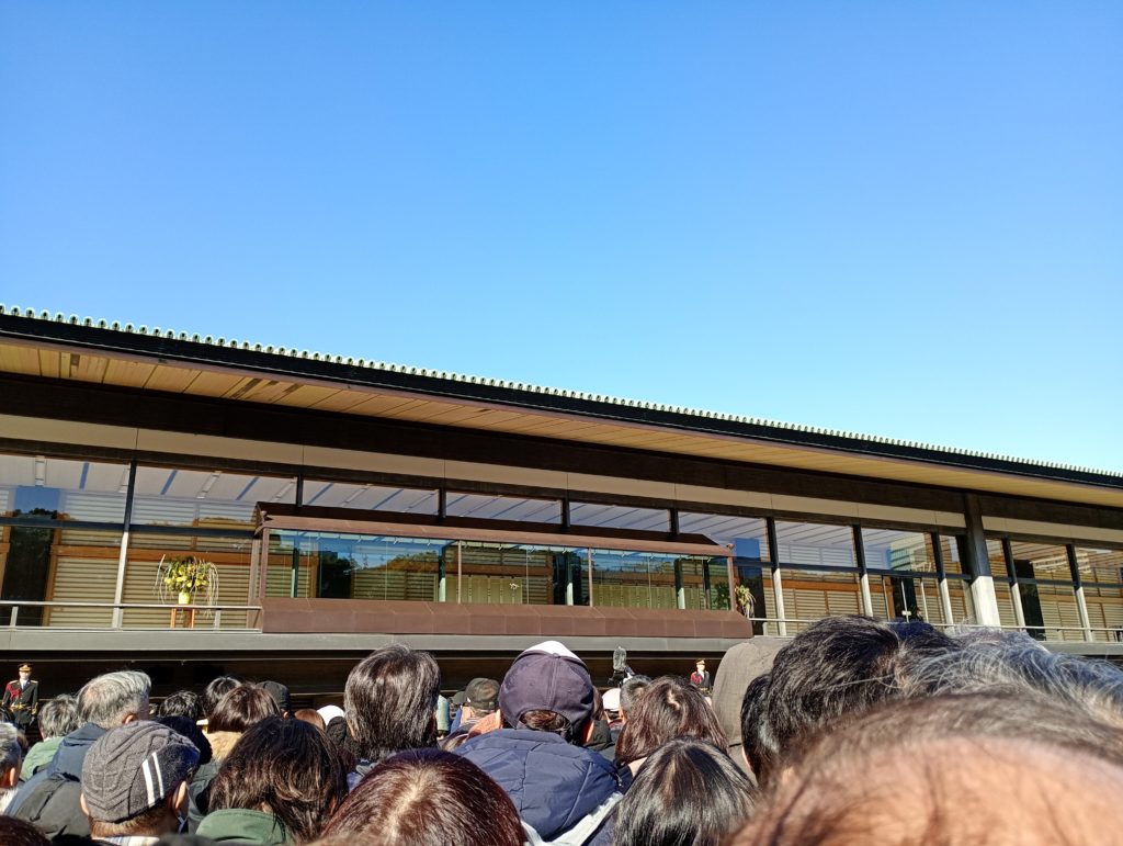 宿泊地の駅から地下鉄経由で皇居の最寄り駅の一つである大手町駅で下車しました。到着時間は早朝の6時過ぎでしたが早くも長蛇の列ができていました。列に並ぶこと数時間午前8時過ぎに列が動き出しセキュリティーチェックを受けて皇居前の広場に並びました。そこで再び待機していよいよ皇居に入りました。会場である宮中三殿まで来ると待ち遠しい気持ちで胸が高まりました。