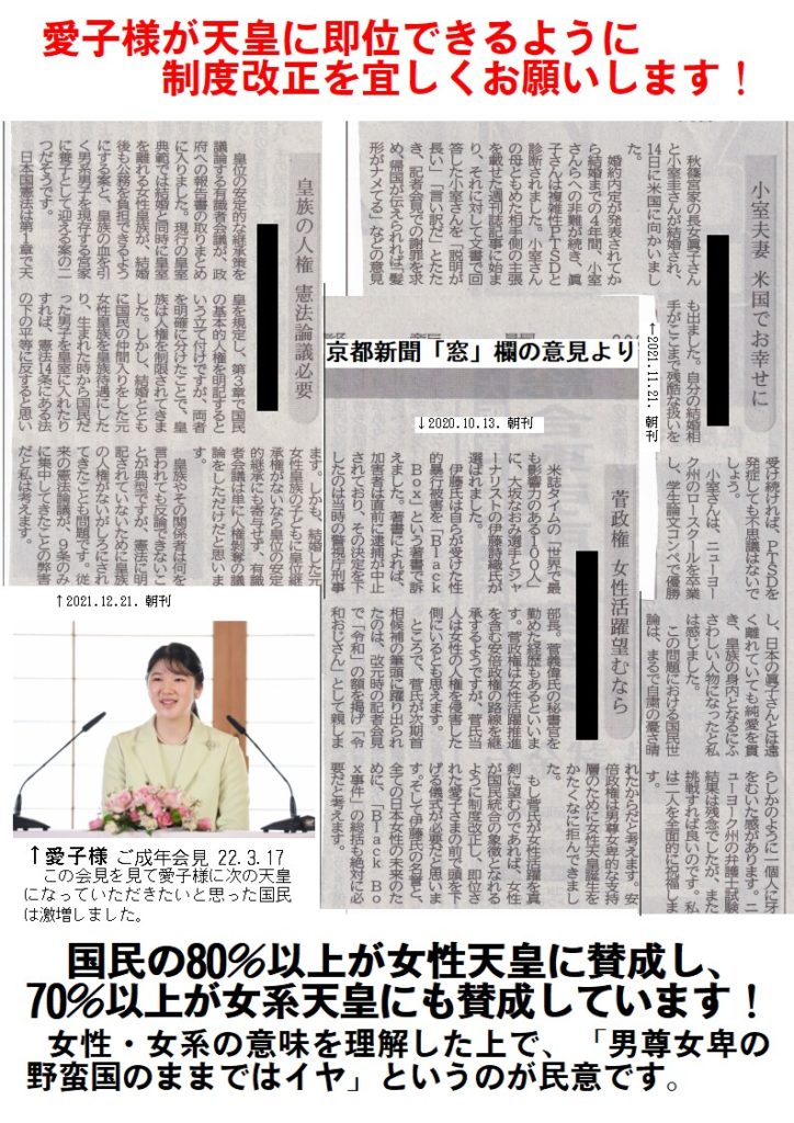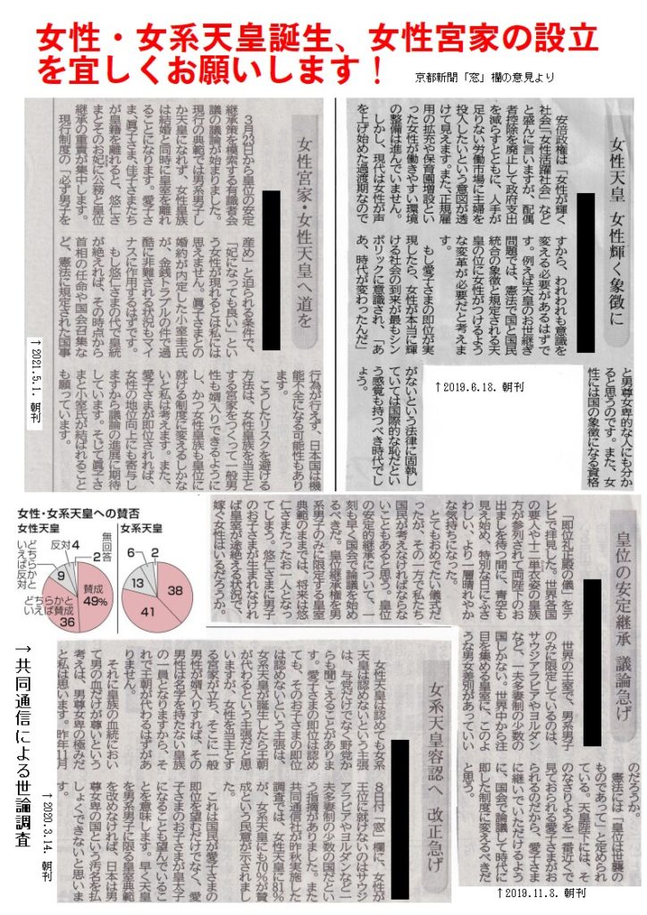 これほど度々、女性天皇を認めるべきという声が掲載されているのを見ると、京都新聞社も理解しているのだろうと感じます。男系派の国会議員は、最後の記事にある「天皇は国民の半分だけを象徴する存在でよいと言っているように思えてなりません」になんと答えるのでしょうか。