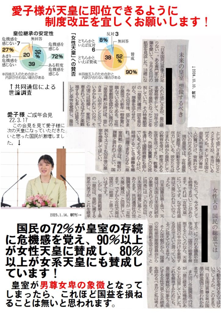 古き良き皇室を守るためには、「男系男子」という因習的な縛りを排除して継承制度をアップデートし、国民からの圧倒的な支持を集める愛子様への継承を可能とすべきだと考えます。現行制度のままでは皇室には悠仁様しか残れず、一般女性が男性皇族に嫁いだ際の凄まじいリスク(男子を産まなければ皇統が絶える!とのプレッシャー↑↑)を考えれば、次代か次々代で皇統は断絶する可能性があり、その時点で日本国憲法の改正(第1章削除)が間に合わなければ法治国家としての日本国は終了します。