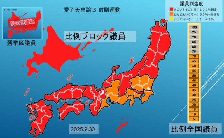 「愛子天皇論3」寄贈運動 日本地図に献本状況 比例全国2ランクアップ&全国区共産・公明100%達成 ゴール献本された方を発表!