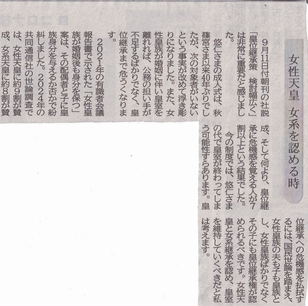 東六条悟です。今回も改変がありました。本当はラストに「もし皇室が失われれば日本国憲法7条の国事行為が不可能となり、もし国会が閉会中なら閣議決定で憲法を停止するという暴挙も罷り通り、国際的な信頼は地に墜ちるでしょう。だから憲法を守るためにも女性天皇と女系継承を認め、皇室を維持していくべきだと私は考えます。」という一節があったのですが、そこはバッサリとカットです。そして文章を弄って変な引き延ばしもされていました。非常に残念です。嗚呼…。