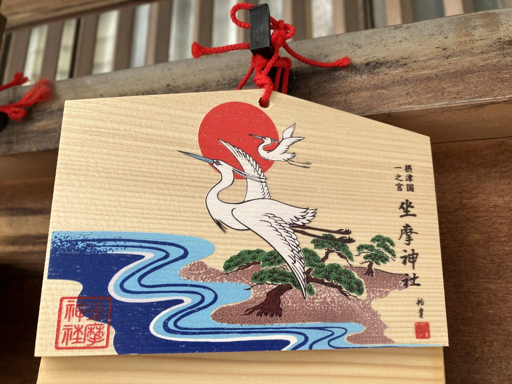 御神紋の白鷺は当社古来のものであり、その由来は神功皇后が坐摩神の御教により、摂津の国・大江の岸の田蓑島(現在の天満橋付近)の松枝に白鷺の群がる所を選び、坐摩神を奉斎なされたというご由緒によります。
